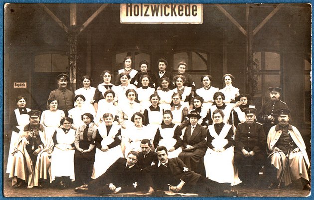 Aus der Zeit des 1. Weltkrieges existieren viele Fotopostkarten mit dem Bezug zu Holzwickede, denn in den Kriegslogistikplänen von 1914 war Holzwickede als Verpflegungs- und Umschlagbahnhof der Militärtransporte fest eingeplant. Die eskalierende politische Lage brachte die zivile Eisenbahnverwaltung schon ab 27. Juli 1914 vollständig unter die Oberste Heeresleitung. Mit der allgemeinen Mobilmachung am 1.August wurde jeglicher Zivilverkehr auf den Bahnstrecken unterbrochen und erst nach Tagen und Wochen wieder eingeschränkt aufgenommen. Es fuhren nur noch Züge im Rahmen der Soldatenmobilisierung und im Militärgütertransport. Der Bahnhof Holzwickede wurde militärische Verpflegungsstation mit täglich möglichen oder erforderlichen mehreren tausend Essensportionen und nachfolgend einmal die Verpflegungsmannschaft. Teilweise über 3.000 Soldaten hatten nun in Holzwickede täglich (!) Rast, Verpflegung und gegebenenfalls Umstieg in der reichsweiten Mobilmachung und in der fortlaufenden Eskalation zu den verschiedenen Kriegsschauplätzen. Ohne wesentliches Straßennetz oder Automobile unterlag die Kriegslogistik konsequent der Eisenbahn.