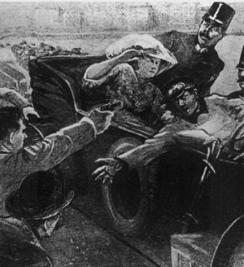 Im offenen Automobil wird am 28.Juni 1914 der österreichisch - ungarische Thronfolger Erzherzog Franz Ferdinand in Sarajevo von extremen Nationalisten aus der serbisch - bosnischem Untergrundbewegung erschossen. Dazu folgend eine Bildillustration (Wikipedia). Ebenso erlag seine begleitende Ehefrau Herzogin Sophie den zugefügten Schussverletzungen.
