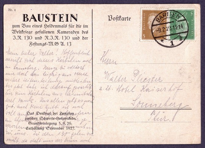 Übrigens wurde vorstehende Bausteinkarte am 9. Tag nach der Einweihungsfeier des Denkmals verwendet.