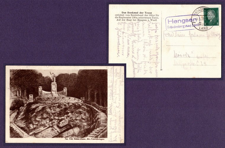 Nachfolgend die Entwurfszeichnung Fritz Richter – Elsner in leicht veränderter Form (Sonne mit Strahlenkranz fehlt) als Ansichtskarte. Die Postkarte wurde an der Landpoststelle Hengsen aufgegeben im Jahr 1931 und lief daher noch über Fröndenberg (Ruhr). Der Text bezieht sich auf einen Besuch am Kellerkopf – Denkmal. Diese Karten waren wohl in der Gaststätte Pampus erhältlich gewesen.