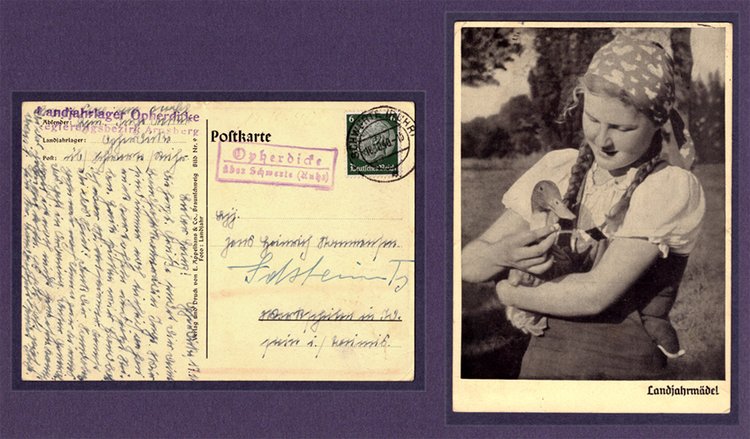 Die nachfolgende Ansichtspostkarte dokumentiert nun eindeutig mit Datum vom 18.10.1940 die geänderte Kraftpostroute mit dem Poststempel Schwerte (Ruhr) und nun mit dem zweizeiligen Kastenstempel Opherdicke über Schwerte (Ruhr). In diesem Fall nun im Absenderfeld noch der Gumminebenstempel Landjahrlager Opherdicke Regierungsbezirk Arnsberg. Vorderseitig ein Landjahrmädel aus dem Verlag und Druck von E. Appelhans &Co., Braunschweig Bild Nr. 9 Foto: Landjahrmädel.