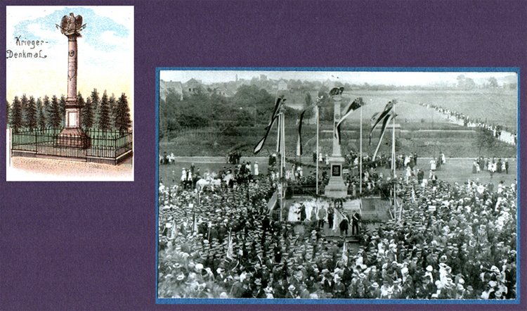 Links Denkmal 1870/71 im Alten Dorf und rechts umgesetzt zum Markt und auf der Kirchstraße (heute Goethestraße) ein Menschenzug aus dem Alten Dorf zur Feier am Denkmal.