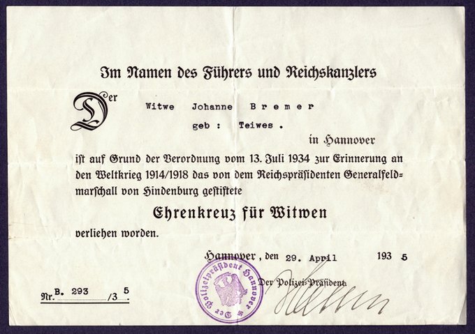 Da war dann rückwirkend zum 1. Weltkrieg das Ehrenkreuz für Witwen im Namen des Führers und Reichskanzlers Adolf Hitler sicherlich auch kein Trost. Siehe auch dazu den Menüpunkt Holzwickede – Zeche spez. 7. Fortsetzung.