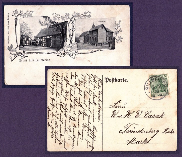 Obige Grußkarte mit dem Gasthof zur Post und Postamtsschild und Briefkasten ging nach Kamen und rückseitig Text mit Unterschrift Carl Hemke.