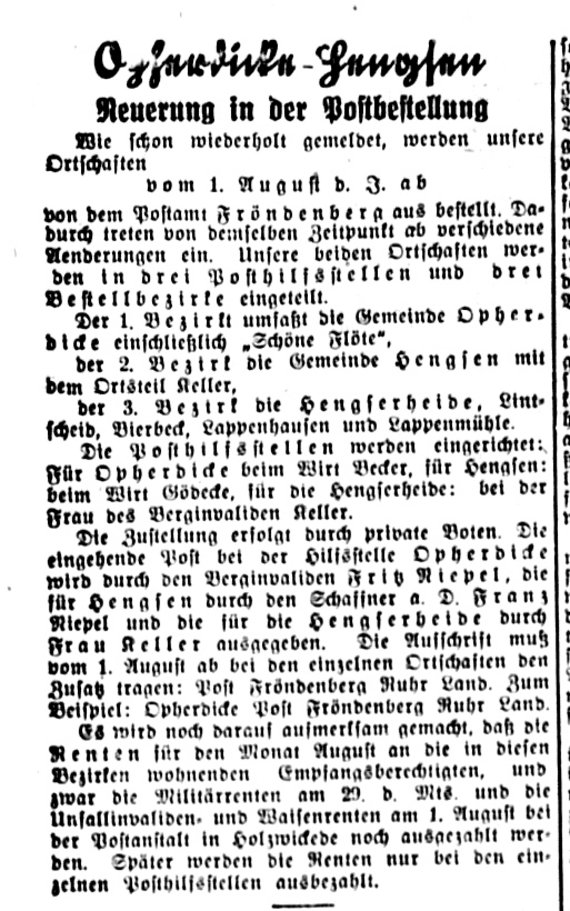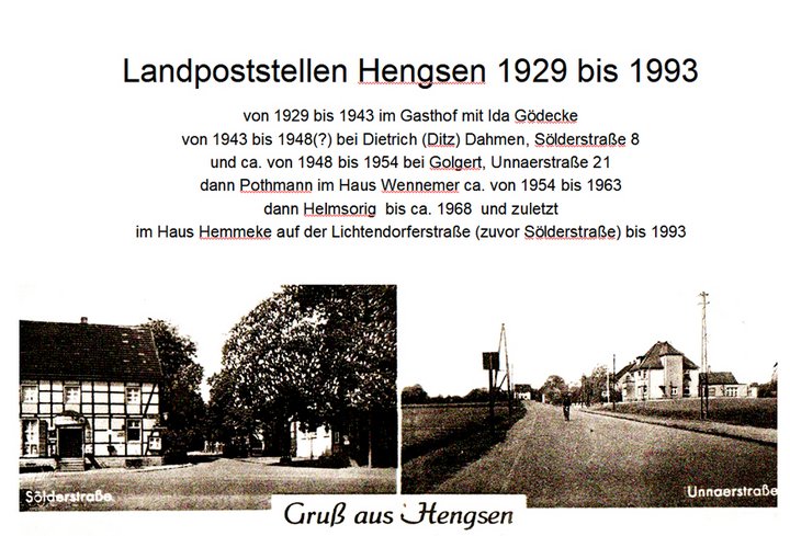Aber neben Opherdicke und der Wiedereröffnung im Haus Becker kamen im Jahr 1929 zwei weitere Landpoststellen auf dem Haarstrang hinzu mit Hengsen und Hengserheide und wurden ebenso wie Opherdicke zunächst der Post in Fröndenberg unter Zusatz Ruhr unterstellt.