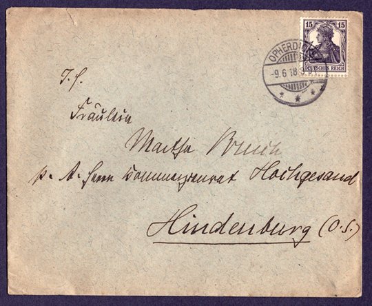 Aus der letzten Kriegsphase des 1 Weltkrieges noch ein Briefbeleg chronologisch mit Zweikreisstempel Opherdicke und dem Datum vom 9.6.1918 nach Hindenburg (O.S. = Oberschlesien).