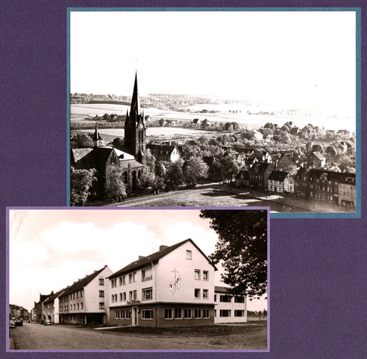 Nicht zu verwechseln mit dem alten Jugendheim der katholischen Kirche ist die neue Unterkunft im Anbau des im Jahr 1958 neu errichteten Kolpinghauses mit Gastwirtschaft Zur Glocke Ecke Kirchstraße und Hauptstraße. Dazu im Ensemble die zugehörige Fotoansicht. Oben rechts das „katholische Viertel“ mit der Straßenkreuzung Haupt-, Kirch- und Josefstraße. Noch Altbau Freise und gegenüber „auf der Wiese“ entstand die verdichtende Bebauung der Hauptstraße mit Kolpinghaus und Anbau neues Jugendzentrum und weiter nach Norden u.a. das Haus Schreinerei Gössmann, Futtermittel Cramer und dann alte Häuser Schäfer.