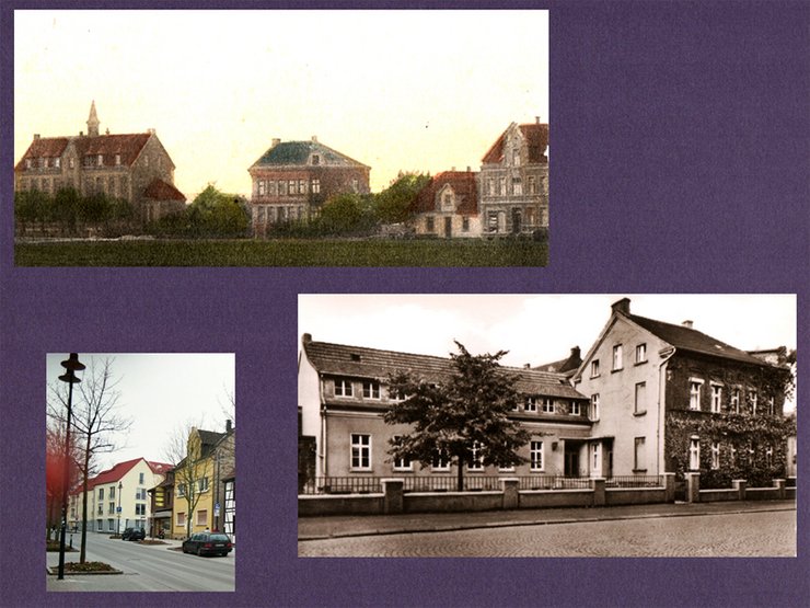 Das obige Ensemble umfasst ca. 120 Jahre Ortsgeschichte Holzwickede. Die linke obere Ansicht dokumentiert die katholische Schule noch mit Glockenreiter und damit somit vor 1905 und belegt den nach Norden angebauten Chorraum und nach Auszug des Andachtsraumes als Lehrmittel- und Konferenzzimmer genutzt. Rechts davon das Haus Heinrich Albert, Lokomotivführer. Die katholische Gemeinde erwarb das Haus (evtl. im Jahr 1919) und richtete hier ein Schwesternhaus und Altenheim ein. Die Ordensschwestern kamen aus dem Mutterhaus St. Marien in Hiltrup. Ca. im Jahr 1923 erfolgte dann der südliche Anbau mit Kindergarten und Jugendheim.
