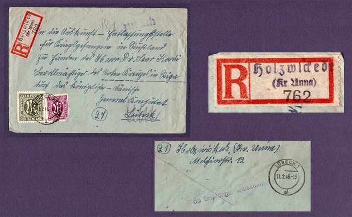 Aber nicht nur Briefmarken waren anfangs Mangelware auch gedruckte Einschreibzettel mit Hinweis Holzwickede im Kreis Unna fehlten und wurden durch Anwendung von Gumminebenstempeln entsprechend „aufgewertet“. Mit frühem Datum vom 9.2.1946 beispielhaft ein Einschreibbrief mit Not-R-Zettel (Detail im Kontrast und Größe verstärkt) aus der Poststelle Aloysiusschule.