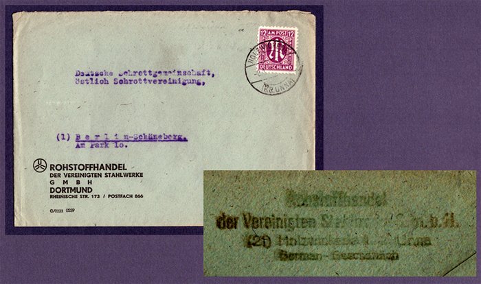 Der Briefumschlag nutzt zwar die Dortmunder Adresse im Vordruck, aber der im Kontrast verstärkte und leider farblich schwache Absendergummistempel belegt aber eindeutig den Rohstoffhandel der vereinigten Stahlwerke (21) Holzwickede Kreis Unna German – geschäftlich in der katholischen Schule. Ferner Poststempel Holzwickede und hier nun die 12 Pfennigmarke der ersten und raschen Briefmarkenausgabe im Jahr 1945 (Freimarke “M“) gemeinschaftlich für die britische und amerikanische Zone.