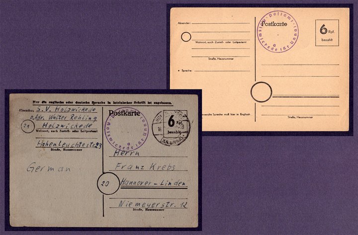 Postkartenvordrucke wurden mit 6Rpf.(Reichspfennige) als Briefmarkenersatz bedruckt, der Postamtsstempel links abgeschlagen und konnten so freigemacht mit Posttagesstempel Holzwickede nach Barzahlung auf den Transport gehen und in diesem Fall nach Hannover – Linden. Hier nun die Postleitzahl 20 für Hannover und 21 für Westfalen und der notwendige Zudruck German in der britischen Zone. Es handelte sich um eine friedvolle Bestellung von Tischtennisbällen.