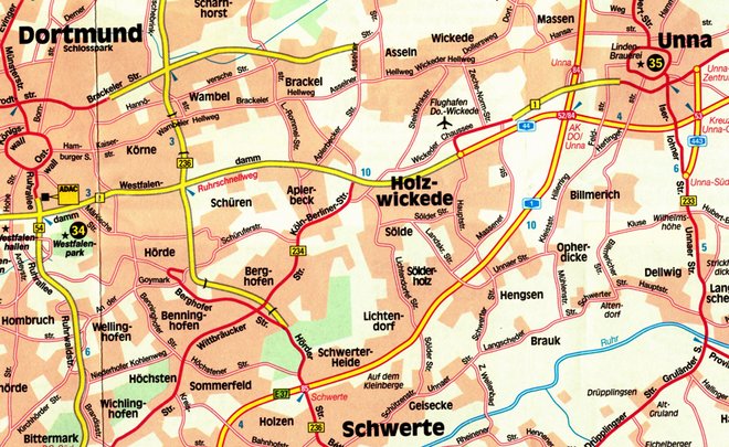 Dicht besiedelt liegt Holzwickede im süd-westlichen Quadranten des Autobahnkreuzes Dortmund – Unna unmittelbar zu Dortmund und Schwerte und der zugehörigen Kreisstadt Unna benachbart im nord-östlichen Quadranten der Straßenkreuzung A1 und A44. Nebenbei bemerkt hier auch die Kreuzung von A1 und B1. Holzwickede ist aktuell die Gemeinde in NRW mit der höchsten Einpendlerzahl an Berufstätigen mit 83% d.h. bei 13.000 Gesamtarbeitsplätzen kommen 10.800 von auswärts und nehmen teils recht weite Anfahrten in Kauf! Oberhalb der B1 direkt benachbart zu Holzwickede der Flughafen Dortmund.