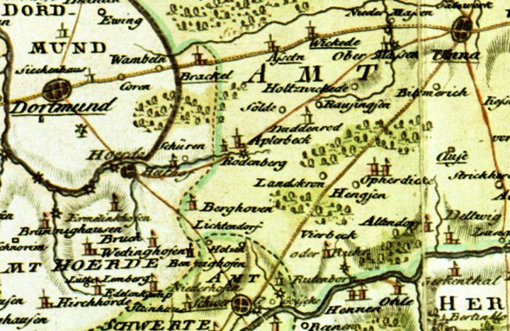 Hinweis: In dem 250jährigen Kartenausschnitt ist die Schreibweise nicht unbedingt mit der heutigen Form exakt identisch s. Holtzwickede und die Straßenwege