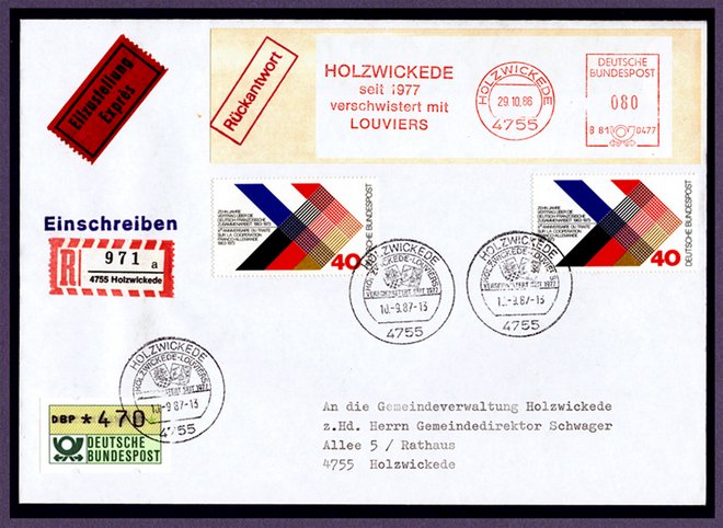 und die folgende Abbildung zeigt ein postalisches Ensemble zu diesem 10jährigen Jubiläum mit entsprechendem Zusatz im Absenderfreistempel (AFS) der Gemeindeverwaltung ferner die deutsch-französischen Briefmarken-Gemeinschaftsausgabe und die Entwertung durch den passenden Sonderstempel 10 JAHRE PARTNERSCHAFT LOUVIER-HOLZWICKEDE. Die Rückantwort war an die Gemeindeverwaltung Holzwickede gerichtet zu Händen des Herrn Gemeindedirektors Schwager