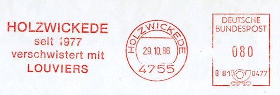 Auch kulturell entwickelten sich Städtepartnerschaften über die Landesgrenzen hinaus. Das 10jährige Jubiläum des deutsch-französischen Vereins führte zum ersten und bis dato letzten Handwerbestempel in der Holzwickeder Postgeschichte und dies im Jahr 1987. Zunächst der Hinweis zum eingesetzten Handwerbestempel. Im Gegensatz zum Handsonderstempel zugehörig zu einem Sonderpostamt oder als zurückgezogener Sonderstempel zu beziehen an den Stempelstellen in Weiden und Berlin, ist der Handwerbestempel ein zusätzlich genutzter Posttagesstempel, der regulär im Schalterbetrieb eingesetzt wird und der rührige Freundeskreis HOLWICKEDE-LOUVIERS hat diesen Stempel auch zu unterschiedlichen Zeiten 1987/88 in der Poststelle Holzwickede „laufen lassen“.