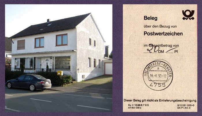 Oben die Poststelle Hengsen im Haus Hemmeke von 1967 (oder 1968?) bis 31.12.1993 und links Tür zum Frisörgeschäft und rechte Tür Eingang zur Poststelle, die von Frau Hemmeke bzw. ihrer Mutter Frau Rothenpieler bedient wurde. Briefkasten vor der Poststelle.