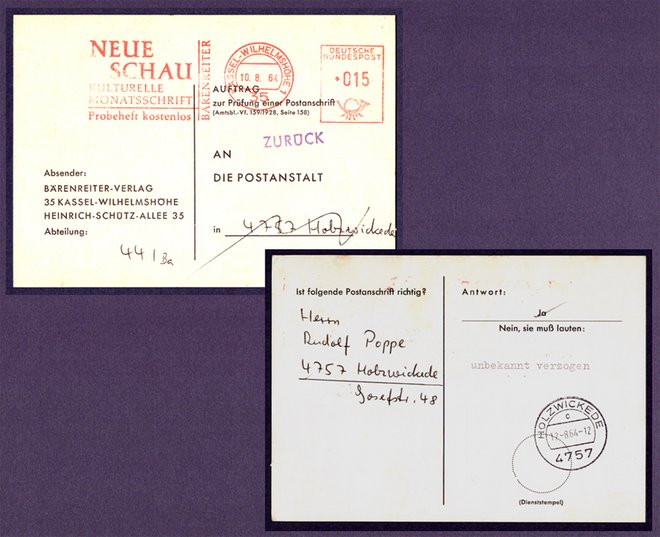 Aus der Zeit der PLZ 4757 einmal ein in mehrfacher Hinsicht interessanter Postbeleg mit vorder- und rückseitiger unterschiedlicher Grundfarbe. Es handelt sich um eine Postkarte zum Auftrag zur Prüfung einer Postanschrift (laut Amtsblattverfügung 159/1928, Seite 158) AN DIE POSTANSTALT in 4757 Holzwickede und mittels Absenderfreistempel freigemacht am 10.8.64 vom Bärenreiter-Verlag in Kassel-Wilhelmshöhe ( Hinweis: die dortige PLZ 35 ist nur 2stellig. Die 4stelligen PLZ erlaubten anfangs je nach Größe des Ortes entsprechend den Postleitgebieten auch 1-bis 4stellige Zahlen z.B. die 1 für Berlin. Ab dem 30. April 1975 trat die Verfügung in Kraft alle 1- bis 3stelligen PLZ durch Aufnullen verbindlich auf 4 Stellen zu erweitern). Für 15 Pfennige war die Post also im obigen Beleg in Holzwickede angehalten, die Postanschrift zu prüfen und dies unter Vermerk der Bestätigung oder in diesem Fall mit dem Hinweis in Schreibmaschinenschrift unbekannt verzogen an den Auftragnehmer zurück zusenden. Ein doch recht aufwendiger Arbeitsablauf und - aufwand einschließlich 2facher Beförderung Kassel-Holzwickede für umgerechnet 15 Pfennige (ob wir doch eine Inflation haben?). Solche Anschriftenprüfungen finden sich nicht allzu häufig und in dieser Form mit Absenderfreistempel und Portstufe 15 Pfennige im Katalog von Werner Götz mit 500DM bewertet.