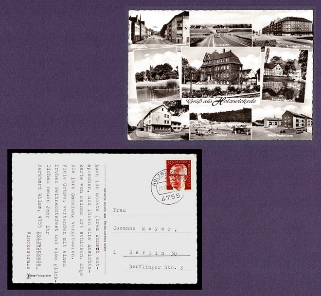 Der Schreinermeister Burkhard Wilms aus der Vinckestraße 26 revanchiert sich oben mit einer Fotoansichtskarte aus Holzwickede bei Frau Susanne Meyer in Berlin.