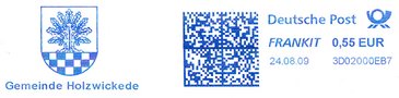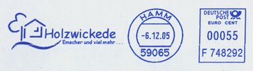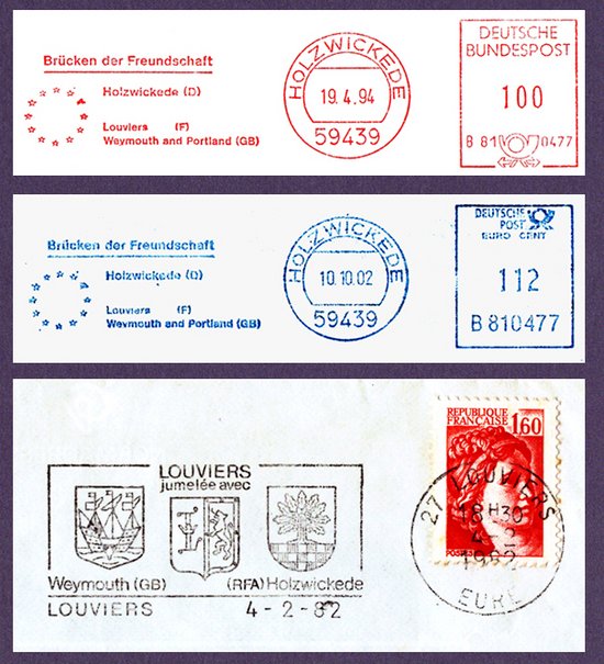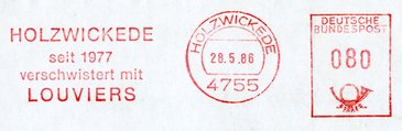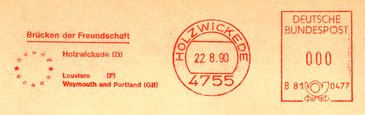 Bezüglich des Absenderfreistempels der Gemeinde Holzwickede zu den Partnerstädten an dieser Stelle auch die französische Version als Maschinenstempel zur Entwertung.