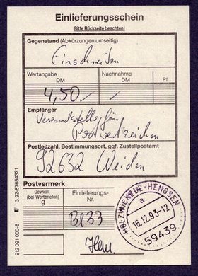 Dazu ein Einlieferungsschein Datum 16.12.1993 registriert in Hengsen unter BL 33 Hem. (=Hemmeke)