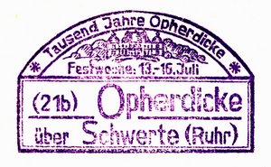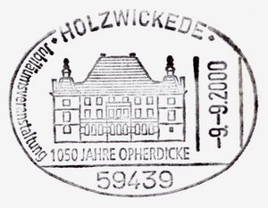 Zurück aus den „langweiligen technischen Rationalisierungsschritten“ und nach der kurzen Vorstellung der Postfreimachung der Gemeindeverwaltung ist im Jahr 2000 beachtenswert ein Sonderpostamt auf dem Gutshof Schloss Opherdicke zur Jubiläumsveranstaltung 1050 JAHRE OPHERDICKE. Nach dem seltenen Landpostsonderstempel im Jahr 1950 zum 1000jährigen Jubiläum war erneut ein und nun Handsonderstempel im Einsatz und Auftraggeber war die Gemeinde Holzwickede.
