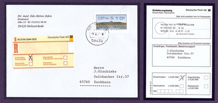 Der Briefbeleg dokumentiert einige Entwicklungen im Versand der Deutschen Post. Zunächst der Hinweis auf die Sendungsform Einwurf-Einschreiben neu eingeführt im Jahr 1997 und hier nun auch ein neuer Einschreiblabel mit lesbarem Strichbarcode und damit scanfähig (s. Hinweis schon oben). Der Code in doppelter Ausführung konnte abgezogen und auch auf die ebenfalls mittlerweile neuen Einlieferungsbelege aufgeklebt werden. Die portogerechte Zusatzfrankatur wurde mit einer Sondermarke der Deutschen Staatsoper Berlin gestaltet, da hier eine verblüffend ähnliche Gebäudesilhouette durchaus mit dem Schloss Opherdicke besteht.