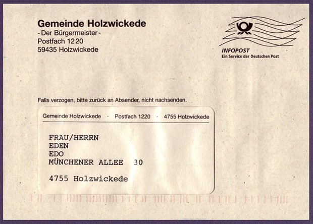 Der Vollständigkeit halber noch zwei weitere mögliche Versendungsformen und hier in Anwendung durch die Gemeindeverwaltung spez. für Massendrucksachen zunächst in Form der INFOPOST - ein Service der Deutschen Post