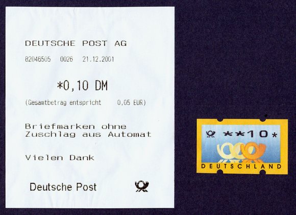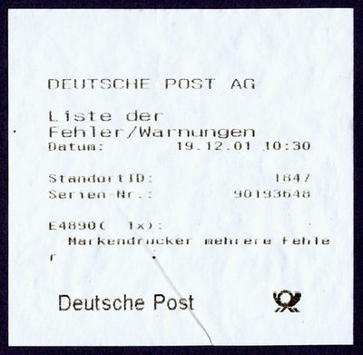 Am 20.12. noch Stillstand aber am 21.12.2001 freudige Überraschung der Briefmarkendrucker funktioniert ! Für Nichtphilatelisten der Hinweis: Im Automaten sind nur 2 sogenannte Briefmarkenleerfeldrollen eingelegt à 2000 Vordrucke und die Tastatur vor Ort erlaubt vorgegebene Wertstufen gegen Bargeld bzw. Geldkarte zum Aufdruck abzurufen.