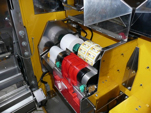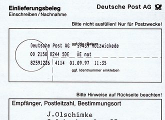 Links ein R-Label selbstklebend auf Folienrolle mit dem abziehbaren Linearcode, der hier einmal beispielhaft auf dem Einlieferungsbeleg gelandet ist.
