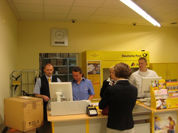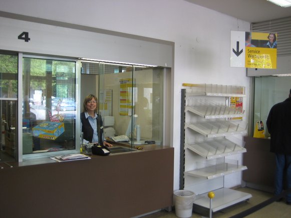 ein Blick auf den Schalter 4 – Paketschalter mit freundlicher Postbeamtin