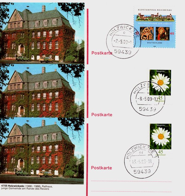 Als eiliger erster Postkunde um 8 Uhr 11 (es gab tatsächlich einen Piccolo zur Begrüßung) gelang mir die Erstdokumentation aber noch mit dem Poststempel aus dem Postamt am Markt mit dem Stempelbuchstaben c im oberen Kreissegment. Der alte Postamtsstempel war noch bis zum 12.5.2009 im Einsatz und zum 13.5. erhielt die Postagentur im EDEKA-Markt den neuen Posttagesstempel mit den Kennbuchstaben pf im oberen Kreissegment und hinter dem Ortsnamen Holzwickede wurde noch die Ziffer 1 gesetzt (war evtl. eine zweite Postagentur eingeplant?). Dazu die Belegbeispiele – leider mit relativ mangelhaftem Abschlag – vom 7./8.und 13.5.2009 und im Kontrast verstärkt und Bildpostkarte mit dem Rathaus Holzwickede