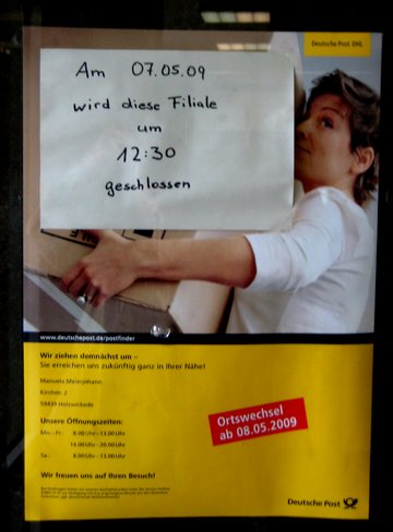 Am Donnerstag den 7.5.2009 wird das Postamt am Markt um 12 Uhr 30 geschlossen