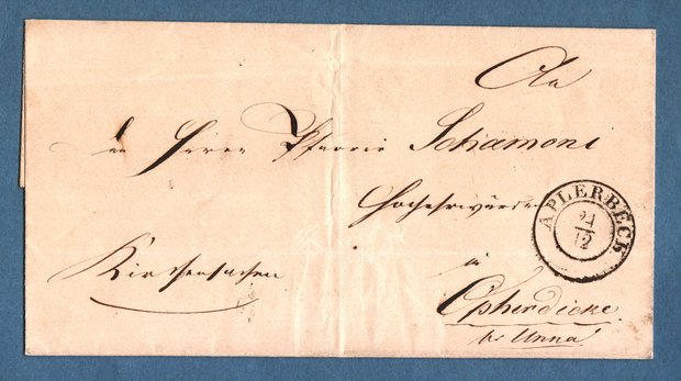 Ein weiterer vorphilatelistischer Beleg kann ebenfalls zu Opherdicke dokumentiert werden. Der Briefbeleg aus Aplerbeck ging an den Pfarrer im Kirchspiel Opherdicke Schamoni und war hier tätig in der St. Stephanus Kirche von 1833 bis 1847
