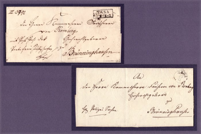 Dazu zwei Briefbelege, taxiert und mit eingeführten französischen Departementstempel versehen. Unter Napoleon wurden u.a. auch im Postwesen etliche Reformierungen z.B. Stempel eingeführt. Einmal aus CLEVES (frz. Rhein) und Rayonnummer IO3 und einmal nur Rayonnummer C.F.3.R (da nur Rayonstempel hier wohl nur als Grenzpostamtsstempel).