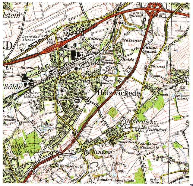 Holzwickede mit z.Zt. ca. 17500 Einwohnern liegt eingequetscht südwestlich im Autobahnkreuz Dortmund-Unna und damit den Autobahnen A1 und dem Übergang Autobahn A40 zur A44 Richtung Kassel. Parallel zur Strecke A40 und A44 verläuft die Bundesstraße B1 die alte Reichsstraße 1. Die A40 Richtung Dortmund wird nebenbei bemerkt aktuell über geplant 8 Jahre 6spurig für viel Geld und stetiger Verkehrsstörung und Unfälle bis zur Todesfolge ausgebaut, damit die Fahrer vor Dortmund schneller im Stau stehen. Die im Bergbau erfahrene Stadt Dortmund hat es in 50 Jahren nicht geschafft, den Verkehrsfluss z.B. durch einen Tunnelbau zu entlasten. So stehen weiterhin 3 Ampelanlagen auf dem Weg der B1 (A40 im Dortmunder Bereich) sprichwörtlich dem Durchgangsverkehr „im Weg“ und sprechen Hohn für den obigen Begriff „Ruhrschnellweg“. Schon hier auch der Hinweis auf den Regionalflughafen Dortmund direkt an der B1 gelegen im nördlichen Randgebiet der Gemeinde Holzwickede.