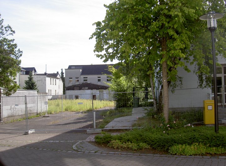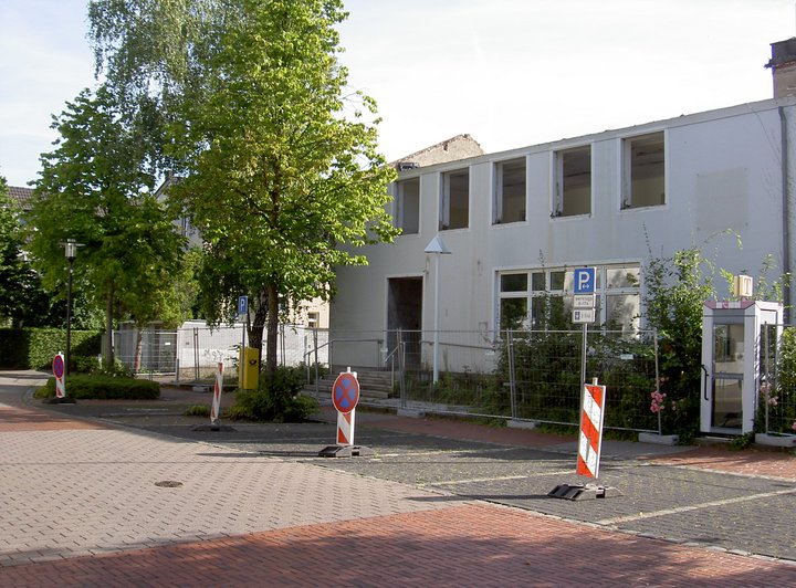 Folgend noch einmal ein Blick auf die Situation im Jahr 2015. Der Hallenbau ist schon abgerissen, im Hintergrund nur noch Restgebäude von Garre zur Karlstraße hin und die stillgelegte Post mit einsamen Briefkasten rechts. Das Gelände bereitete der Investorengruppe „Wohnen am Markt“ recht viel Ärger mit Asbestresten im Erdbereich.