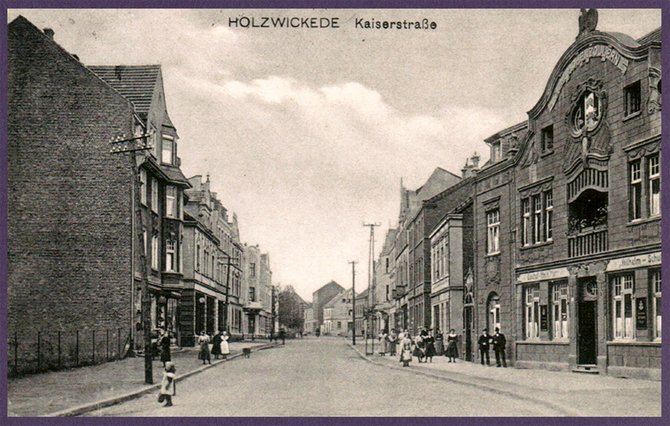Die folgende Ansichtskarte dokumentiert dazu mit der rechten Häuserzeile folgende Reihenfolge: Gaststätte Hohenzollern – Nachfolgebau Jaques (heute Bambusgarten), dann das alte Haus Hinnerwisch (1898 erbaut und beim Luftangriff 23.3.1945 zerstört) und anschließend das erwähnte Haus Griesel aus dem Jahr 1895 und dies damals zunächst unter Orts- bzw. Straßenbenennung Hohenleuchte 1 und ca. ab 1904/5 Umfirmierung zur Kaiserstraße Nummer 8.