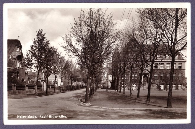 Der Gemeindevorsteher Theodor Rieke wurde dann zur weiteren Amtszeit auf der konstituierenden Sitzung der Gemeindevertretung durch die Zentrumspartei vorgeschlagen und auch noch einmal gewählt am 28. März 1933. Der Hofbesitzer Friedrich Wilhelm Spring mit langjähriger NSDAP – Mitgliedskarte wurde zunächst nur Stellvertreter. Auf dieser Sitzung erfolgte auch eine rasche ersichtlich NS – konforme Straßenumbenennung und Holzwickede bekam eine Adolf-Hitler-Allee (für Alleestraße), eine Hermann Göring-Straße (für Nordstraße), eine Horst Wessel-Straße (heute Am Markt), eine Schlageter-Straße (für Poststraße) und aus früheren Zeiten war man schon mit Sedan-, Gneisenau- und Moltke-Straße „beglückt mit militärischem Klang“. Übrigens die Umbenennung der Kaiserstraße in Admiral Scheer-Straße erfolgte ebenso wie die Josefstraße in Hans Schemm-Straße erst im März 1936. Nachfolgend die Fotoansichtskarte nun als Adolf Hitler-Allee in süd-nördlicher Richtung mit dem rechts gelegenen Rathaus. Die Baumbepflanzung hat deutlich an Höhe gewonnen und dass Rathausgebäude selbst erscheint schon weinberankt bis zum 2. Obergeschoss. Der Marktplatz war zum Hindenburgplatz umfirmiert worden.
