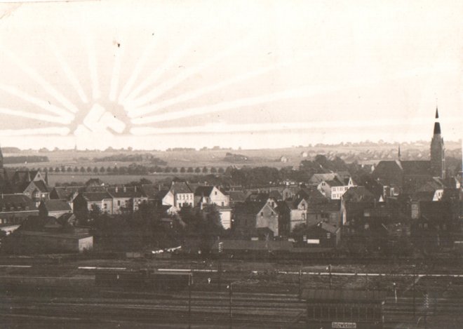 Über Holzwickede „strahlte nun das Hakenkreuz symbol- und schicksalsträchtig vom Haarstrang herunter“ (seltene Fotopostkarte, schwieriger Scan der schlechten Vorlage).