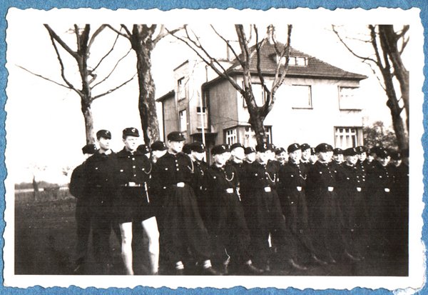 Nicht ohne Grund baute sich in dieser Perspektive die Hitler Jgend auf. Dr. med. Lotz später noch Mitglied des Reichstages baute das Arztpraxishaus auf dem Marktplatz ca. im Jahr 1934/5 (später hier Vater und Sohn Drs. Watermann und dann Dr. Pappert) direkt an der damaligen Horst Wessel-Straße (heute Am Markt) und gegenüber dem evangelischen Pfarrhaus aus dem Jahr 1908 gelegen. Im Jahr 1935 erhielt die NS – Gruppierung Holzwickede 1935 in Nürnberg eine SA – Standarte verliehen. Träger wurde besagtes NS – Mitglied Dr. Lotz. Folgendes Bild dokumentiert die feierliche Einholung der SA-Standarte in Höhe Ecke Adolf Hitler Allee/Parkstraße vor dem Haus des Mediziners Dr. Voigt (Haus wurde beim Luftangriff 1945 zerstört und lag quasi gegenüber vom Haus Lotz auf der anderen Marktplatzseite). Bild aus dem Buch von Herbert Wilhelmy aus der Reihe Archivbilder HOLZWICKEDE im Sutton Verlag GmbH Erfurt im Jahr 2005.