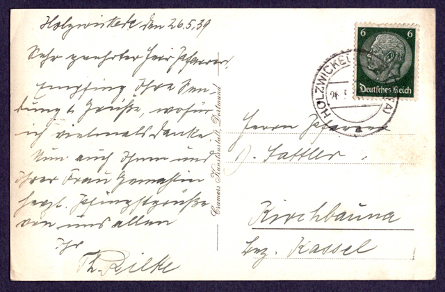 Sowohl der ehemalige Gemeindevorsteher Theodor Rieke und auch der Pfarrer Walther Sattler hatten ihre Ämter und ihre Tätigkeiten unter der NS – Zeit in Holzwickede aufgegeben und waren aber in Kontakt geblieben s. nachfolgende Postkarte vom 26.5.1939 von Holzwickede nach Kirchbauna (aktuell Baunatal und neue Wirkstätte damals von Sattler).