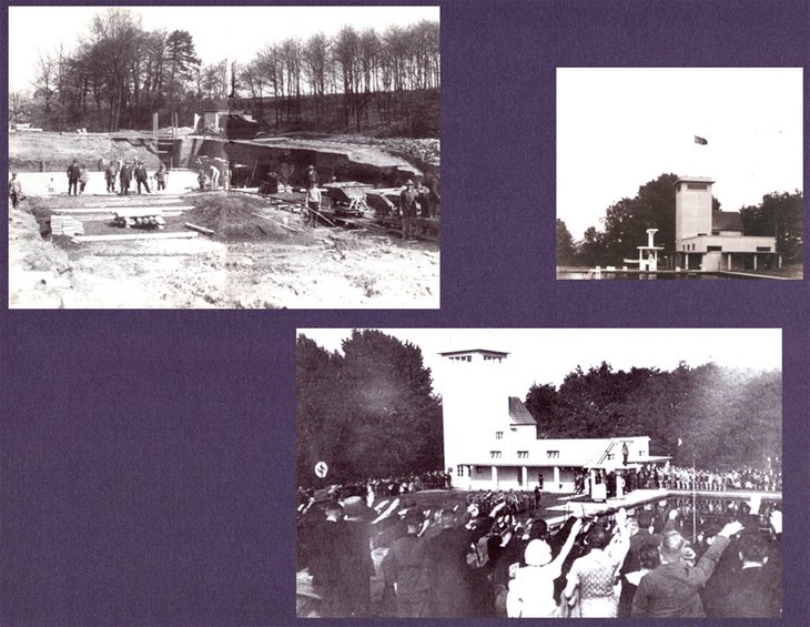 Einweihungsfeier am 26.August 1934 durch Gemeindevorsteher Spring in NS – Inszenierung. Eine Hakenkreuzfahne wehte fortan auf dem Aussichtsturm (auf der Plattform war ein wunderbarer Ausblick über das Gelände möglich). Folgend einmal ein seltener Fotoblick von dieser Plattform über das Freibadgelände im Jahr ca. 1938 auf die Beckenlandschaft und den Umkleidebereich (zu Beginn waren es ausrangierte Waggons der Reichsbahn). Ferner der 5m Sprungturm und die Wiederholt-Rutsche am Beckenrand