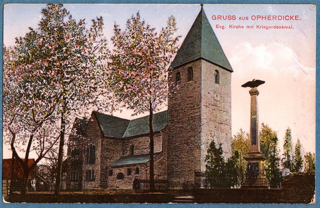 Das Ehrenmal (für Opherdicke und Hengsen) wurde auf der Ansichtskarte, die übrigens im Jahr 1905 datiert, ca. im Jahre 1875 zu Ehren der Gefallenen aus dem Krieg 1870/71 im westlichen Teil des Kirchengeländes aufgestellt und den Adler in damals üblicher und allgemeiner Ausführung auf der Denkmalspitze hatte der Sturm noch nicht verwittert zum Absturz gebracht.