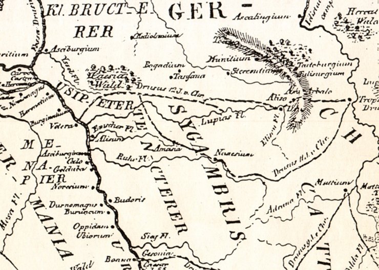 Die Römerlager an der Lippe sind bekannt und hier ist in OBERADEN - ca. 20 Kilometer nördlich von Holzwickede entfernt - eines der vermutlich größten Römerlager nördlich der Alpen zu nennen. Die Größe des Lagers war wohl dem strategischen Ziel angepasst, Germanien zu erobern und lokal das Gebiet der germanischen SUGAMBRER zu „befrieden“. Die folgende Skizze (im Jahr 12 v.Chr.) belegt die Verhältnisse zur römischen Zeit mit Drusus 38 v.Chr. bis 9 v.Chr. (römischer Feldheer und Stiefsohn von Kaiser Augustus 63 v.Chr. - 14 n.Chr.) mit dem Grenzgebiet der germanischen Stämme der Brukterer und Sugambrer im Lippebereich.
