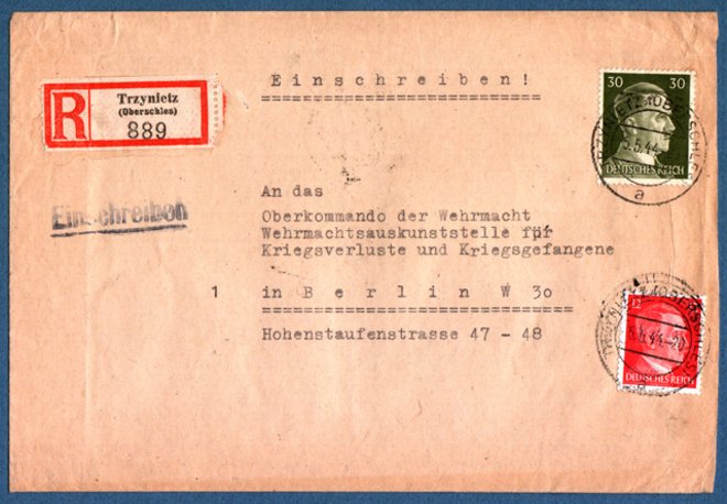 und der obige Briefbeleg aus der Hauptstadt der Bewegung mit der Markenausgabe UND IHR HABT DOCH GESIEGT ist Sarkasmus pur und das Oberkommando der Wehrmacht und damit auch Wehrmachtsauskunftsstelle für Kriegsverluste und Kriegsgefangene in Berlin hatte sicherlich zunehmend traurige und tragische Mehrarbeit. S. nachfolgender Briefbeleg