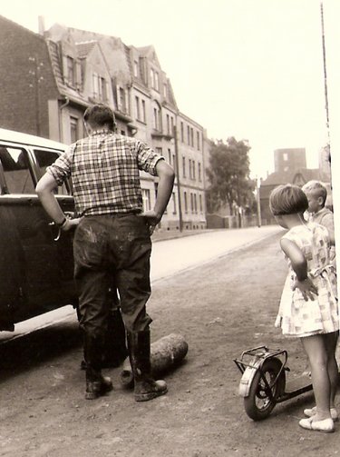Die frisch ausgebildeten Kinder vom Bombenentschärfungs- und Räumkommando waren noch rasch auf dem Roller vorbei gekommen und beurteilten sachkundig den Abtransport der Bombe im bereitgestelltem VW – Bulli - vielleicht aus dem Bekanntenkreis geliehen. Die umgebenden Häuser waren sicherlich geräumt, nicht transportfähige Bewohner im Krankenwagen abtransportiert worden und Feuerwehr und Polizei sind vermutlich nur zufällig nicht mit auf dem Bild (?!). Aktuell werden immer noch entsprechende Stadteile mit bis zu 20.000 Menschen evakuiert und dem würde ich - selbst betroffen - nicht widersprechen ! Aber wohl kurzfristig und tatkräftig entschlossen und vermutlich ohne Verwaltungsbürokratie gelang so und in dieser Haltung beispielhaft anscheinend der erstaunliche Wiederaufbau im zerstörten Westdeutschland nach dem 2. Weltkrieg.