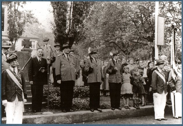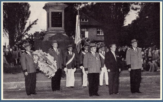1955 feierte der Bürger-Schützen-Verein sein 90jähriges Jubiläum und dazu die beiden folgenden Bilder zur Totengedenkfeier vor dem Denkmal auf dem Rathausplatz.