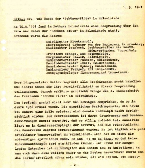 Erwähnenswert ab dem Jahr 1960/61 ist die Renovierungsplanung des Freibades Schöne Flöte. Dazu eine Kopie der Rathaussitzung vom 30.8.1961. Es finden sich umfangreiche Unterlagen dazu und ein eigener Menüpunkt Schöne Flöte wäre einmal sinnvoll. An dieser Stelle nur der Hinweis auf den Architekten Rehage aus Bad Rothenfelde mit seiner Begutachtung der umfangreichen und sanierungsbedürftigen Freibadprobleme (Kriegsschäden, neue Anforderungen an das Filtersystem usw.)