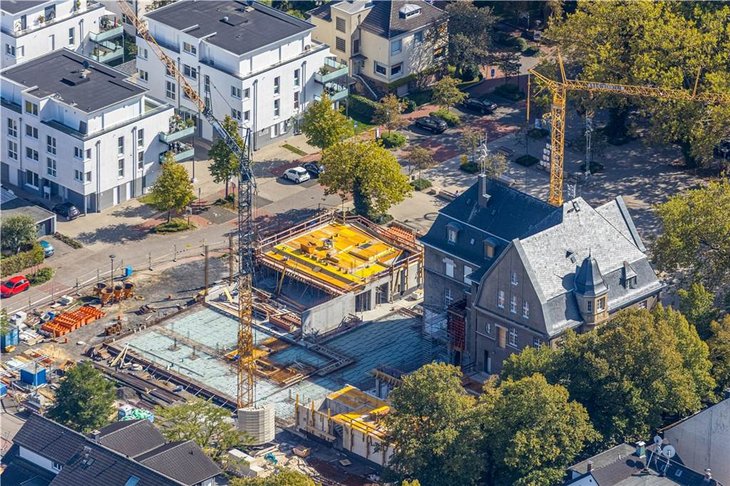 Die Gebäude der Poststraße 2 und 4 sind vorstehend bereits planiert und im direkten rechten Anbaubereich ist schon die Bodensicherung (s. Bergbau) durch etliche versenkte Betonsäulen erkennbar, denn fester Gesteinsboden lag erst in 12 m Tiefe und die Verzahnung mit dem Altbau erforderte absolute Stabilität (s. Durchbrüche Treppenhaus und Aufzug aus dem Foyer in den Altbau hinein)