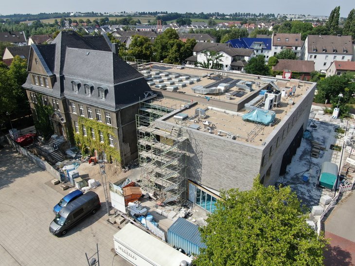 Oben sind die Fundamentarbeiten abgeschlossen und erste Gebäudestrukturen erkennbar (Copyright H. Blossay). Die Rohbaufertigstellung konnte im August 2021 erreicht werden und dazu eine weitere Luftbildansicht (D. Drossel) noch mit restlichem Baugerüst